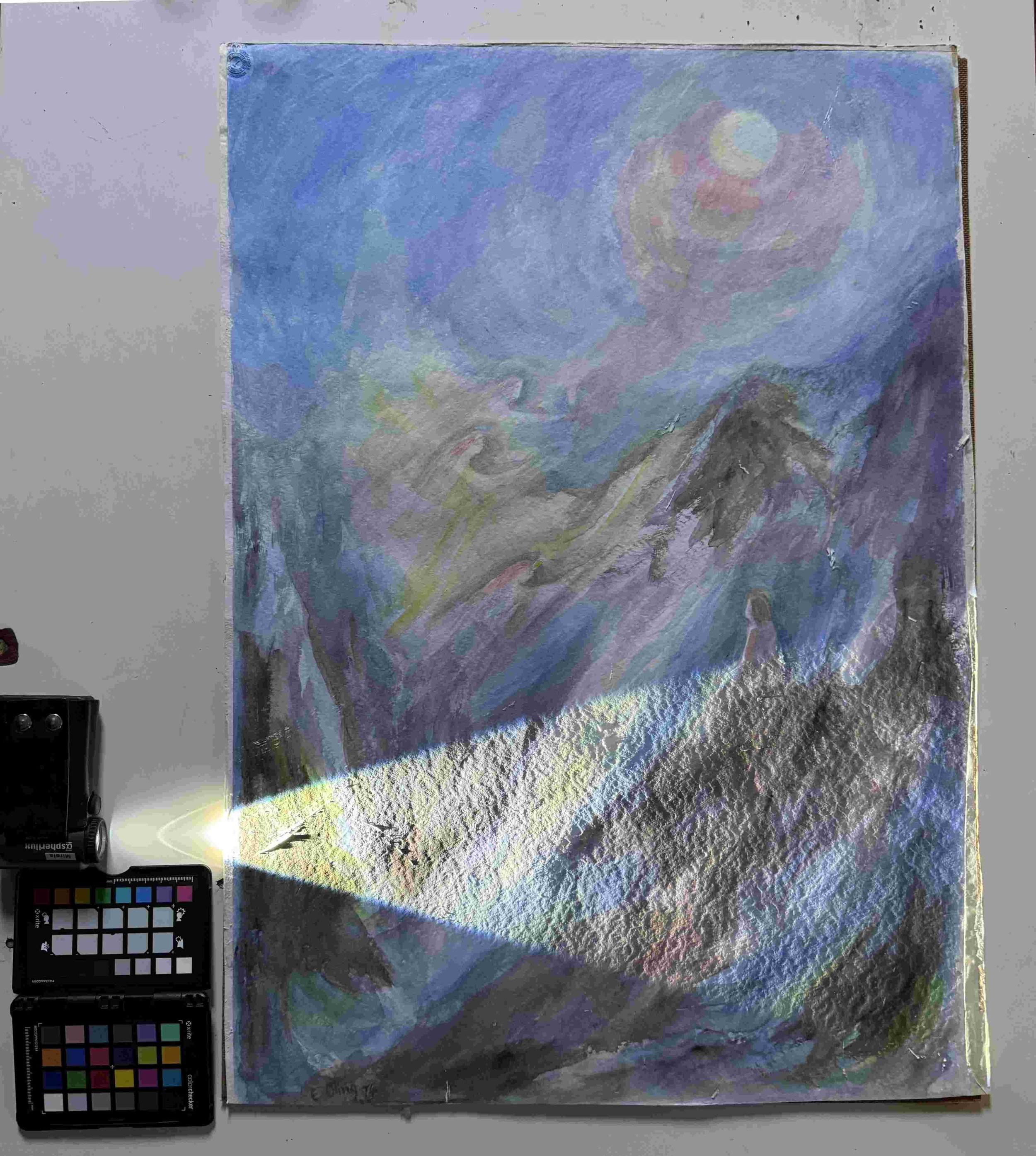 Das Aquarell von Elisabeth Jelinek Oling, das eine Größe von etwa 50 x 75 cm aufweist, wurde beim Aufhängen beschädigt. Der Schaden entstand durch einen Sturz des Bildes, wodurch die Oberfläche des Kunstwerks beeinträchtigt wurde. Die Folge sind oberflächliche Kratzer und Fehlstellen am Aquarell.